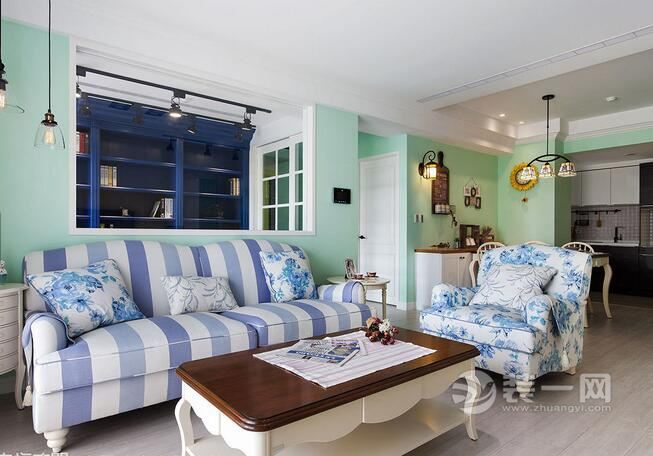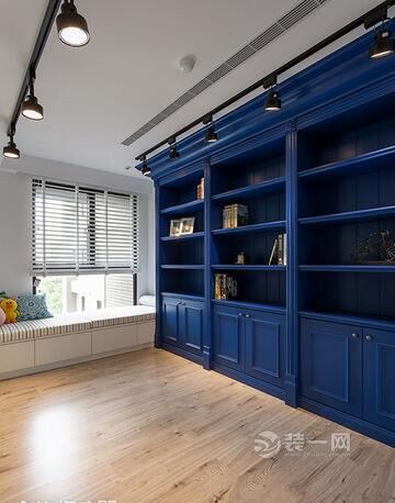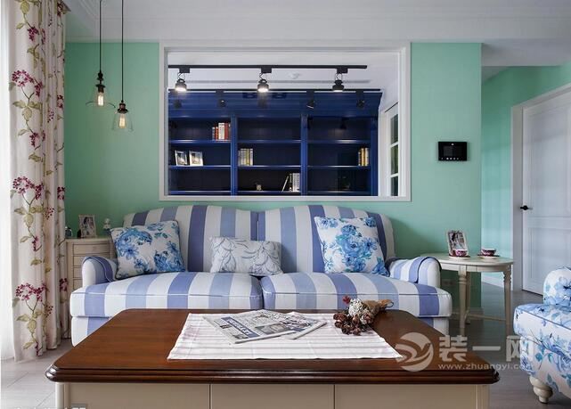 越过窗框的视线落在后方书房的宝蓝色书柜,与前方浅蓝条纹沙发共筑井然有序的景深层次。