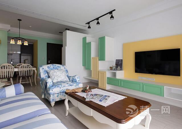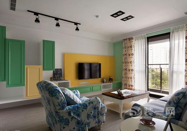高低错落安排的电视柜跳接草绿色与暖黄色调,表现屋主的年轻活力亦彰显设计创意。