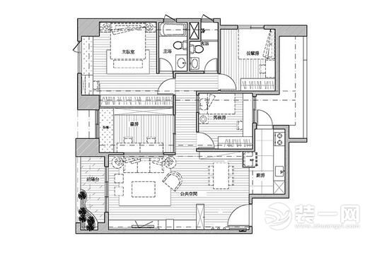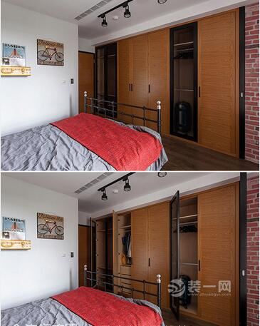 私领域中依照使用者性格赋予独立表情,优雅白色调的孝亲房以传统美式乡村风情呈现,而弟弟房则是营造黑白灰工业风的俐落性格。沿著L型牆面铺设红砖色文化石的主卧房,是屋主在规划之初即提出的设计想法,春雨时尚空间设计保留局部的留白牆面与木皮衣柜,以现代人文况味平衡浓烈粗犷,增添空间暖度。