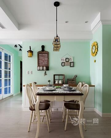 嫩绿色的牆面搭配美式乡村风格家具、彩绘玻璃灯具与复古街灯造型壁灯,以铁件勾勒出古典气质。
