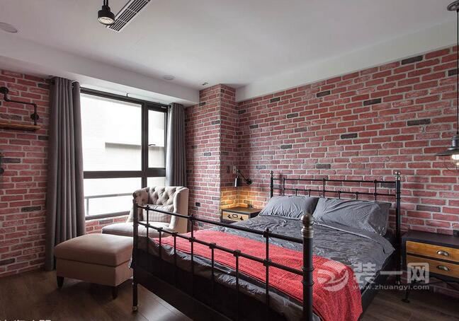 红砖色文化石环绕的主卧房呈现浓烈粗犷的工业风表情,春雨时尚空间设计透过局部留白与木皮表现,平衡空间暖度。