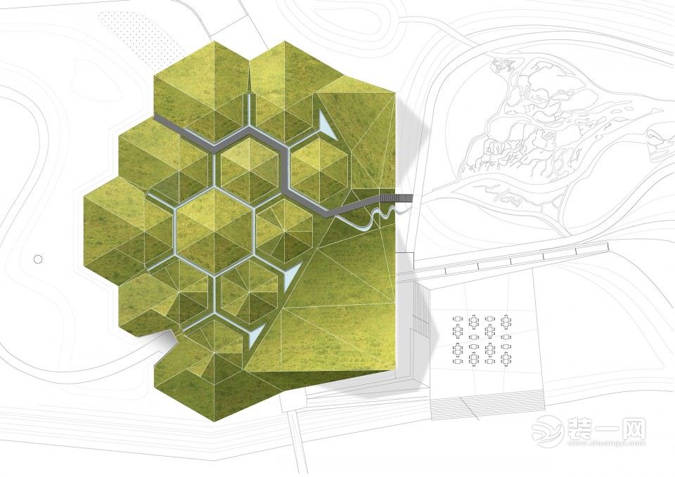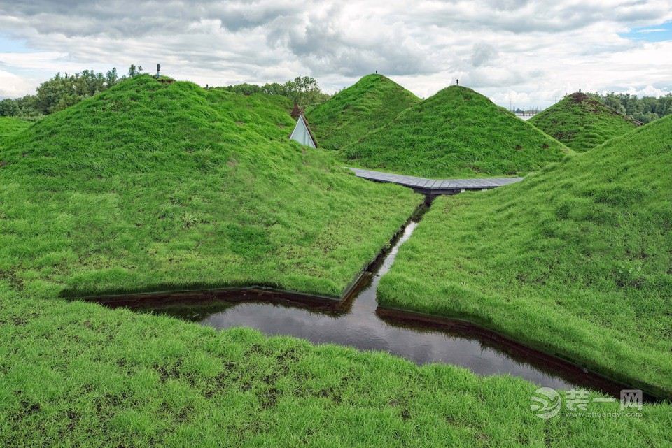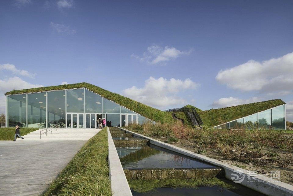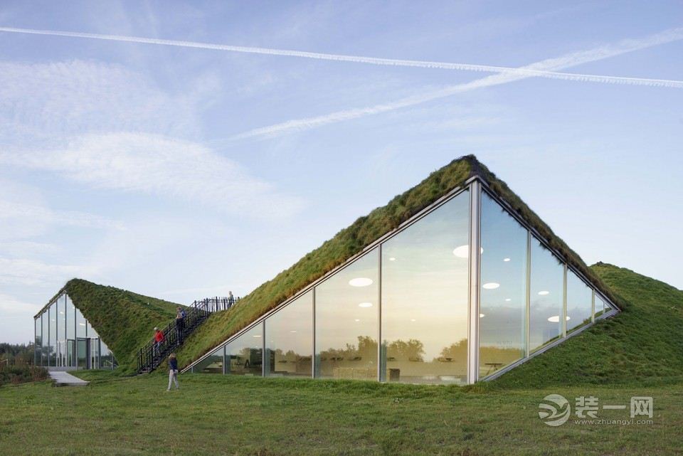 新老建筑为大地的景观所环绕,也被满草的屋顶所覆盖。事实上,屋顶增加该地区的生态价值,为其营造了可以称之为大地艺术的雕塑,同时也使自身在环境中凸现出来。起伏的屋面上是小山一样的景观,其间铺有小路,小路的尽端有一座可以瞭望景色的平台。