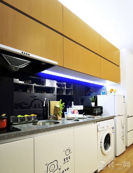 小户型智能家居装修效果图:收纳性极强的厨房,房间的另一边直接是开放式厨房,所有家电都被收纳得井井有条,显得干净整洁。