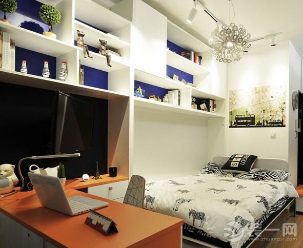 小户型智能家居装修效果图:客厅、餐厅、厨房、卧室、书房一体化!且看做是书房吧!可收缩的电视,既满足了追剧一族,又很好的节省了所占用的空间!两全其美!