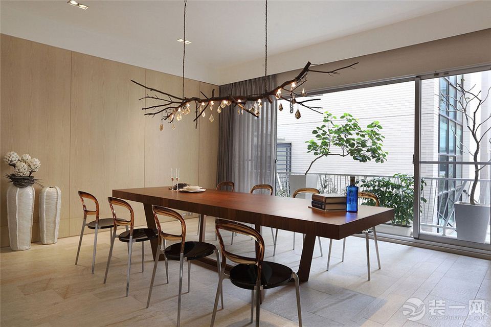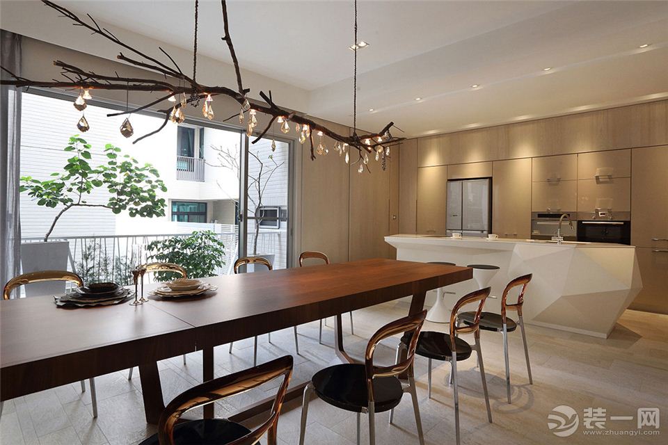 地坪处,板岩磁砖以不规则切面铺排而起,归置上大型长桌满足了女主人宴客时弹性,空间中最亮眼地莫过于预藏有水晶的枯木订製吊灯,粗犷却又不失华丽点亮著个性十足的飨食时光。