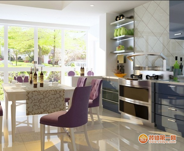 整体橱柜让厨房空间更干净利落,满足了主人储物需求,超强的收纳性也帮了主妇们不少的忙,更加节约了厨房的空间,独立的用餐区域的布置有一点田园风情,增加了不少就餐情趣。餐台不但是橱柜的有效延伸,更是空间功能的补充。敞开式厨房的运用,主人感受到的不仅仅是开阔与方便,更多了一些舒适与惬意。餐台的设计是时下厨房装修中又一新型的设计走向,同时又增加吧台的布局,让厨房生活丰富很多。