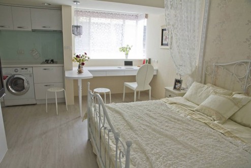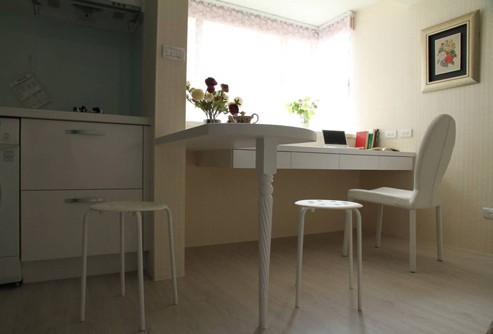 1、小套房里依然要拥有怡然自得的段落分明,是设计师给予屋主的惬意,因此入门的结构墙串联上餐桌分野了厨房与阅读机能,而L型的桌面设计则巧妙兼备化妆桌等弹性运用。