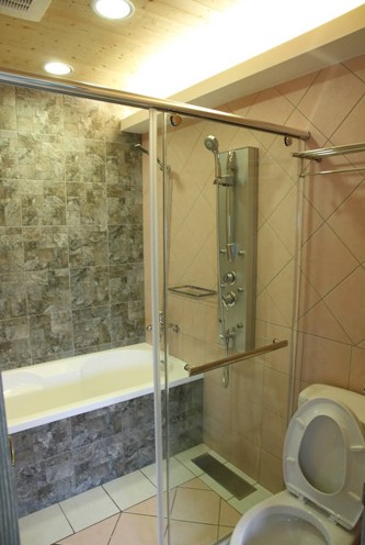 不同于整体空间的柔白,复古砖铺陈的卫浴空间有着湯屋暖度。