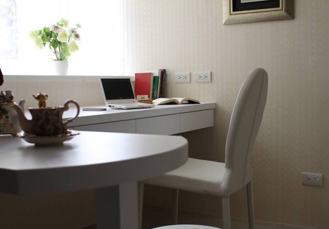 入门的结构墙串联上餐桌分野了厨房与阅读机能,而L型的桌面设计则巧妙兼备化妆桌等弹性运用。