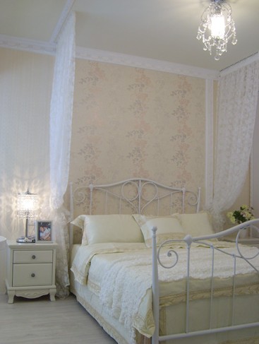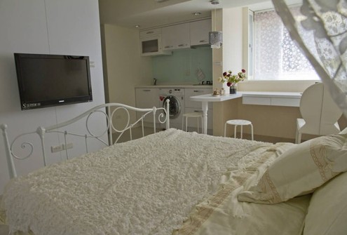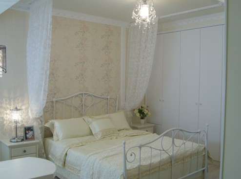 都会女子浪漫情怀是小套房里的风格表现,设计师顺应女主人期盼以一份白净为基底,窗纱舞动、精致线条形塑公主般的柔美。