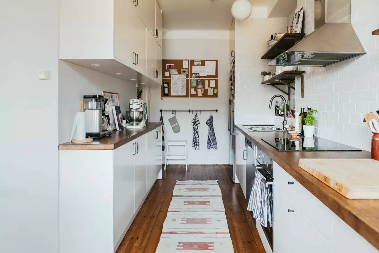 厨房面积宽敞,适合那些可以通往阳台的房型。一侧为处理食材和烹饪的区域,另一侧则用来收纳电器等物品,形成一种封闭的厨房设计,非常灵活,操作方便。然而,对于厨房空间较小的情况,不建议采用这种布局,因为会使厨房变得拥挤。