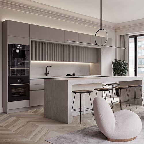 开放式厨房是一种适合大户型和成员较多家庭的设计。岛台型厨房最引人注目的地方就是让厨房变成一个社交场所,家人和客人可以一起准备食物、用餐、喝酒、聊天和举办派对。厨房的布局可以根据个人喜好来设置动线。