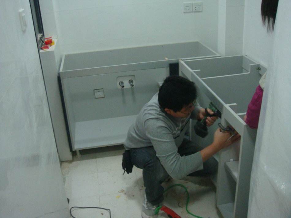 8、厨卫贴砖:在此期间,通知橱柜厂家准备复量,通知门厂上门测量。贴地砖前,装好入户门。大约3-4天时间。