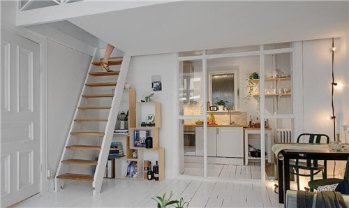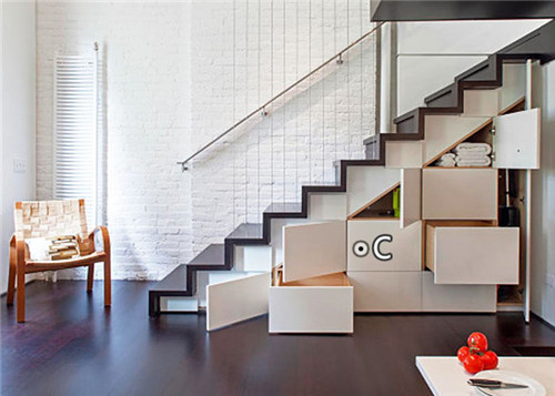 5、小复式当然还少不了楼梯,我们可以选择做成占地面积小的折梯、旋梯,或者也可以做成带有储物功能的楼梯,楼梯的跳板要做好圆角处理,栏杆宽度不宜过大。
