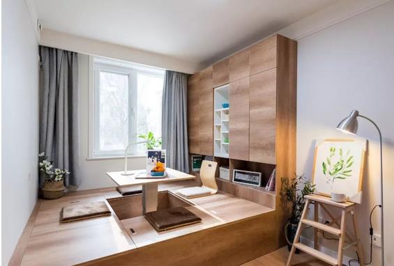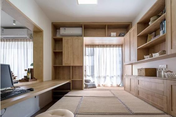 2.多功能次卧首先能想到的方案就是做榻榻米。榻榻米地台更好是做一部分抽屉,比上翻门要方便很多,当然不要被边上的书桌挡住抽屉也是很重要的。