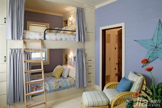 推荐理由:这款儿童衣柜是和儿童床相连在一起的,床边上就是衣柜的抽屉和隔间,这样小孩取衣物的时候比较方便。