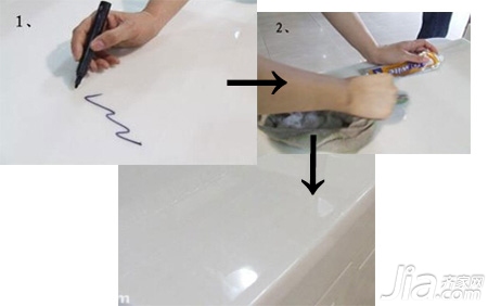 为了测评该款洗脸柜台面的耐污性,小编用记号笔在台面上随手画上一道浪线,风干后用湿抹布仔细一擦,发现台面光亮如新,可见台面的耐污性能还是比较强的。