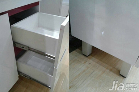 该款洗脸柜柜体内外表面、抽屉内表面均采用一底一面的油漆处理,这样可以让产品更易清洁。同时,该柜体收纳空间大,功能分区比较合理。落地形式让柜体更牢固、简单、大方,柜脚采用铝合金材质,可以防锈防潮。