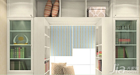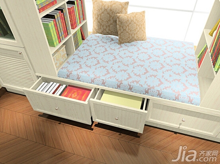 英伦印象系列书柜利用墙面和飘窗结合设计,飘窗的下面设计了一排矮柜作为底部抽屉式收纳柜,上面则做成舒适的沙发座椅,两侧开放式的书柜让这里既方便休息又便于阅读,取书、放书分外方便。