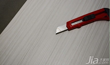 小编用美工刀在板面上划动,可以观察到轻微的划痕,所以在这提醒大家,虽然这种纤板经过吸塑处理之后有很强的耐刮性,但对于尖锐的小刀还是无法抗拒的。