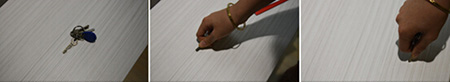 用尖的钥匙在板面上来回刮,刮了一分钟之后板面没有明显刮痕,说明衣柜的中密度纤维板板材很耐刮。但如果动用小刀来刮会怎样呢?