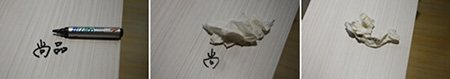 用油性笔在板面上写上“尚品”两个字,一分钟过后用纸巾擦拭,轻轻一擦油性笔的笔迹就没有了(这里小编没有用酒精),由于板面进行过吸塑处理,表面光滑,所以很耐脏并且容易清洁。