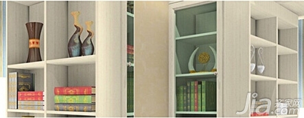 尚品宅配英伦印象系列书柜两侧做了半玻璃、半封闭式书柜,上面做了一排半开放式顶柜,增加了书房的收纳空间,该系列专为喜欢情调、时尚优雅的用户打造。百叶造型门板与精雕细琢的装饰线条,搭配上两边通透的木框玻璃门,足以勾勒出古典家具的风韵与格调。