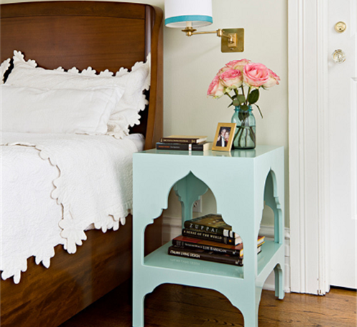 随着美式风格的流行,美式田园风格成为当下主卧装修风格的新宠。田园风是一种讲究自然、随性、清新的风格。这一点我们从床上用品就可以看出。所以,卧室柜也可以走随性的路线。图中的床头柜设计非常简单,没有封闭空间,浅绿的配色给人迎面扑来的清新感,显得非常温馨。