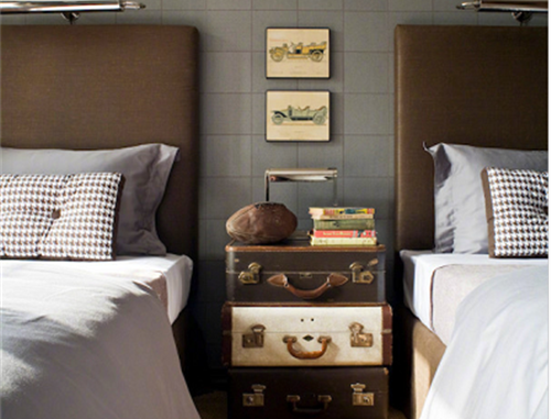 旧物总是可以让我们回忆起往事。旧物改造在装修中也非常热门,对于一些陈旧的旧物,只要经过用心的改造也可以焕发第二春,就如图片中一样,三个老式行李箱堆成一个床头柜,非常有年代感。