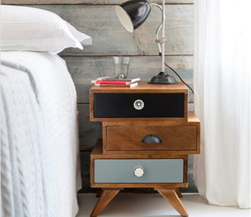 对于现在的都市年轻人来说,个性、时尚、前卫的家具、设计更能捕获他们的芳心。我们来看图中的床头柜,采用三层抽屉设计,但在设计上却做了很大的改变。大家在看惯了整整齐齐,有没有被这种不对齐的造型所吸引呢?抽屉门三色交替,给空间带来色彩上跳跃感。