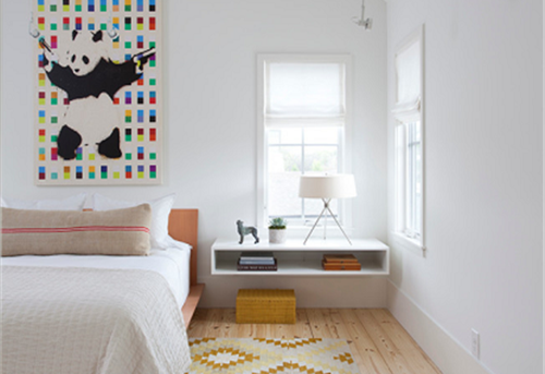 卧室柜悬空是一种怎样的设计?看到这张效果图你就明白了。全悬空的设计,给人不一样的空间感。不仅是作为床头柜来满足一些收纳需求,还是一张小书桌。不管是午后还是夜晚的灯光都可以营造出不错的阅读气氛。不得不说,小编被这张四方小黄凳圈粉了。