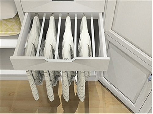 衣柜有进行裤架设计的话,尺寸一般保留65厘米,如果选择衣架挂放则需要预留70厘米的尺寸,裤架以及衣架距离层板应保持在4-6厘米之间,这样方便拿取裤子。