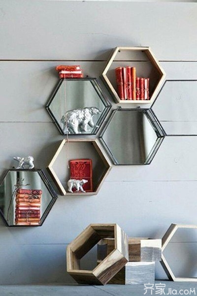 这个蜂窝状的书柜设计很有个性,用吊柜形式设计在墙面上深浅色调相间设计,很有艺术性。用多个六边形拼在一起,就成了既美观又实用的墙面装饰与收纳,用来放书或放装饰品均可。