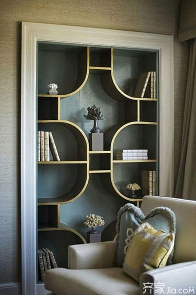 这样的书柜设计你可能是第一次看到,整个书柜做了嵌入式处理,墙面中内嵌的书架,圆润而优美的弧线拼接出个性图案,划分出的不同收纳空间,就成了书本和花瓶的安身之处。