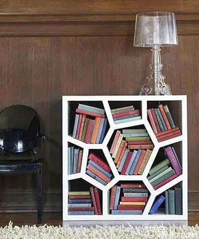从外形来看这个书架虽然是方方正正的外形,但是里面蜂窝状的设计形式也让这个书架拥有更时尚的元素。边框方正的书架内部,被分割成大小形状不一的小格子,创意十足。