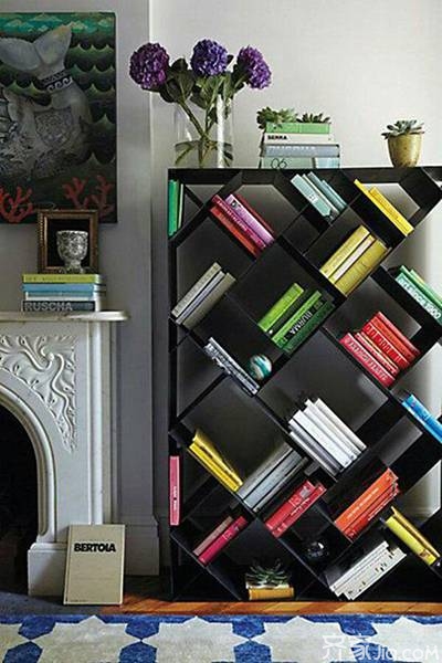 这个书柜采用全部黑色形式设计,简单富有几何线条感,每个格子里都能放十本左右的书,总体容量并不是很大,纵向叠加的菱形格子拼成书架,适合空余的角落和墙面的边缘。