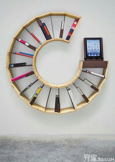 圆环一样的书架很有一种视觉上的圆润感,可以放置一些优质的书籍,旁边在放一把椅子,一个安静的读书角就打造完成了。把书架做成车轮状,让人眼前一亮的设计。既留出了收纳空间,又让墙面显出独一无二的个性。