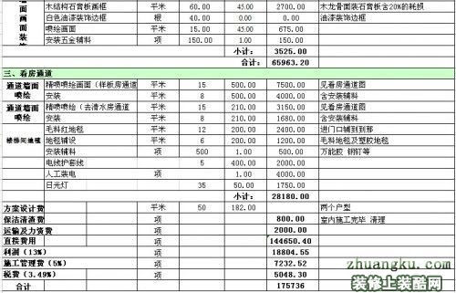 装修预算造价表建议用电子表格;然后列出一份装修清单,从地面、墙面、天棚、天窗、油漆、拆除、垃圾清理及外运、脚手架、水管铺设、贴砖、电工、木工等,按工序进行分类,每项后面列出材料费、人工费、耗损,每一小栏进行小计,每个项目标明编码、项目名称、计量单位、工程量、项目特征,综合单价(含税),汇总出总价。