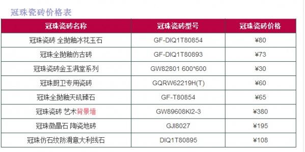 以上就是冠珠瓷砖的质量及部分价格的介绍,希望对大家有所帮助!总的来说,冠珠瓷砖作为全国前三的瓷砖品牌,不管是质量还是口碑都是非常不错的,大家如果想要购买瓷砖,就可以考虑购买冠珠瓷砖。