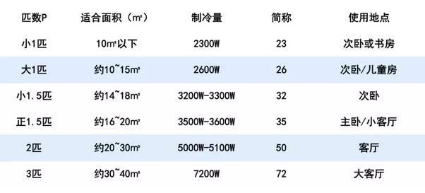 一般10㎡以下空间你就选小1匹,10~15㎡卧室选大1匹,15~20㎡选1.5匹,大于20㎡更好选立式2匹以上的,具体参考下方表里的数据: