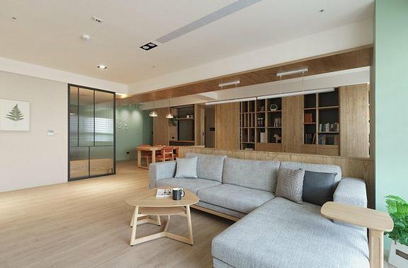 除了电视和沙发的那面墙,也不要小看窗户那面比较“碎”的墙面,可以安装收纳柜,摆放书籍或者充当展示柜,效果棒棒哒。