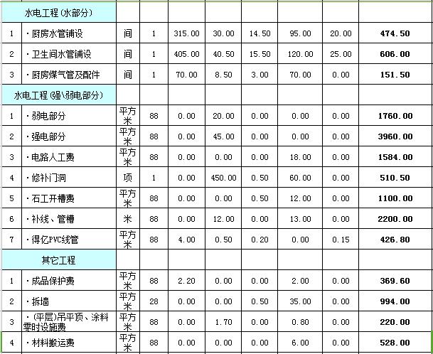 装修面积:88平米。装修预算:14800元左右。水电工程可以算得上室内家庭装修的更重要部分了,哪省钱,水电安装也不能省啊,业主在购买主材的时候也要购买高品质的好材料。