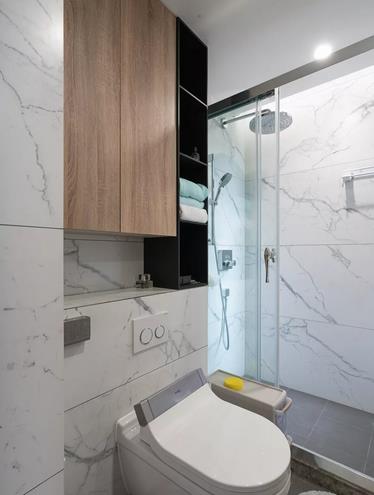 马桶背后的墙面空间,看大多数案例中都是啥也不做的,而实际上这个死角完全可以利用起来做成置物收纳。