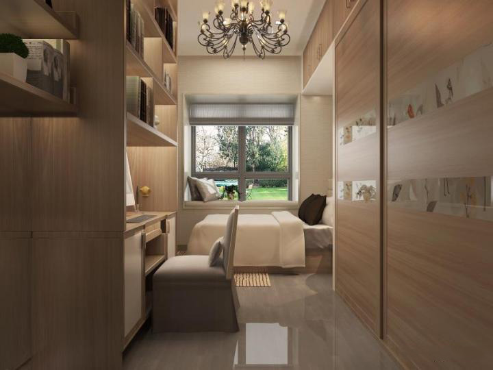 如果房间空间确实比较小可以选择嵌入式的衣柜,因为狭长型卧室宽度是不够的所以就对于家具的摆放尽量不要选择两样家具并列摆放。灯具的选择也不应该用大型灯具,显得整个房间更小。