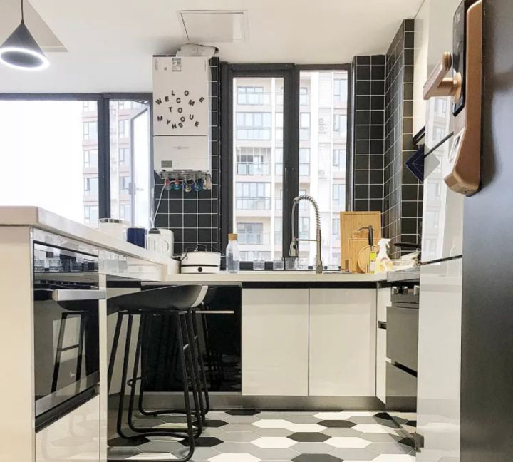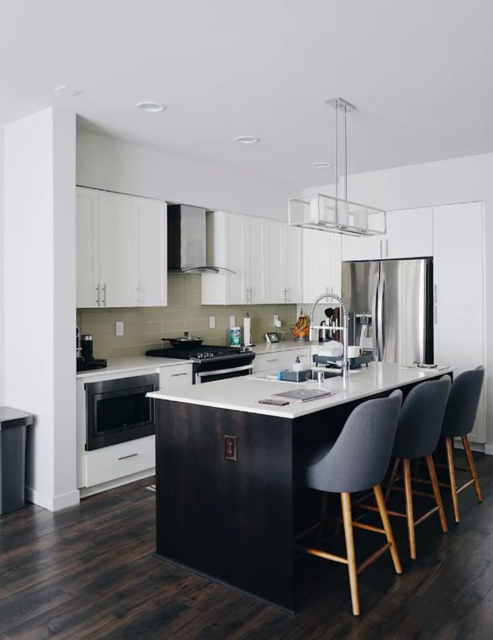 1.开放式厨房的料理台形状,可分为L型和一字型。L型比较适合面积较小的厨房,一字型适合面积较大的。