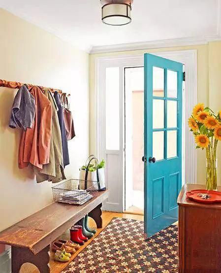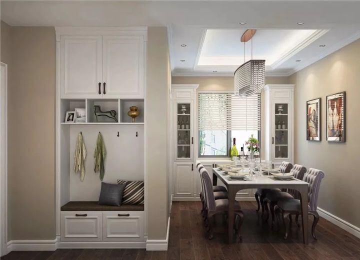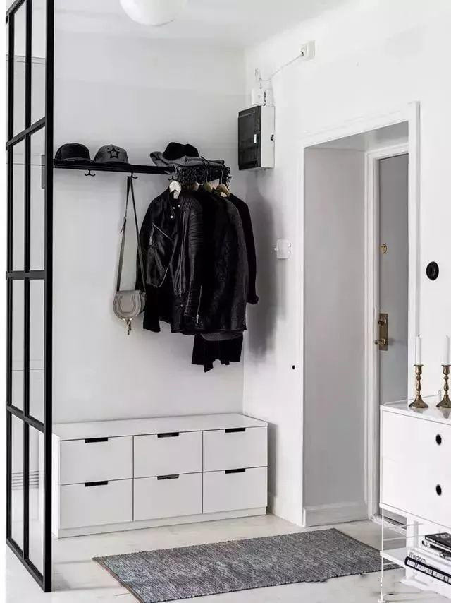 三是定制一个简易的玄关,这种情况适用于入户门正对餐厅,但空间太小不能做隔断的户型。简易玄关只需要换鞋凳,衣架等布置。