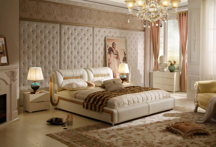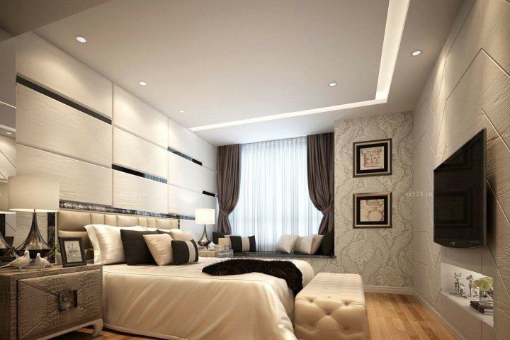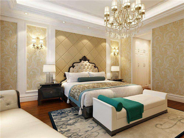 卧室的床和床头柜可以选择在常规的尺寸上适当扩大,再在床脚安装一个床脚凳和大地毯还可以安装一个床幔,将睡眠区和