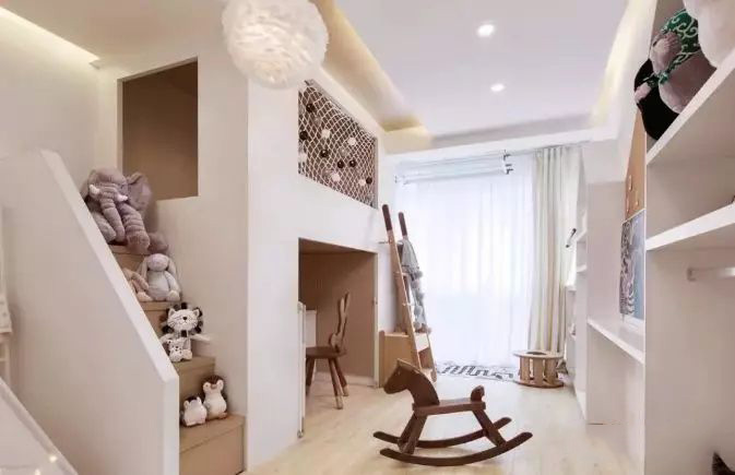 最开始对于小面积卧室我们的装修方案是做母子床,上床下桌,且楼梯可以做成抽屉的收纳柜。