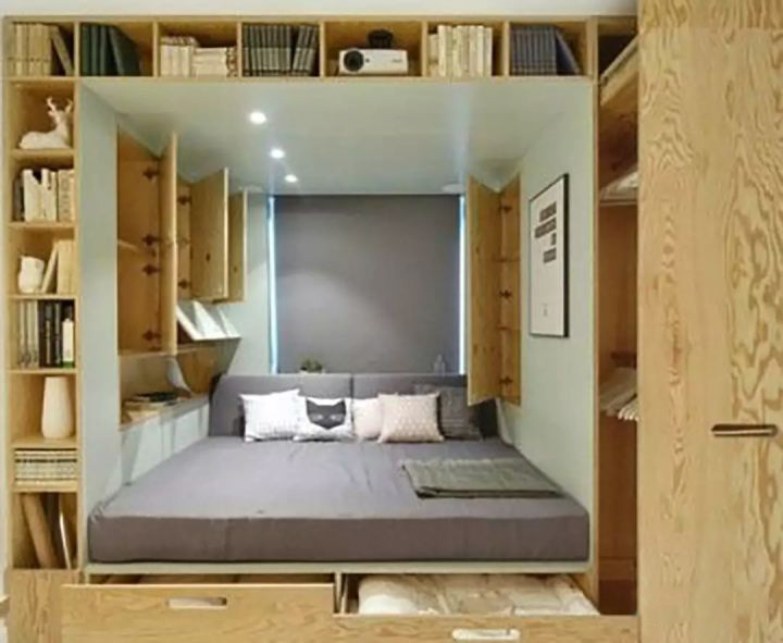 全屋定制的装修方式比较符合这个房间,相当于将空间利用这个难题甩给家具装修公司。然后你只需要点头、摇头交钱就好了,而且全屋定制的家具尺寸比较符合整个房间,而且风格也比较搭。