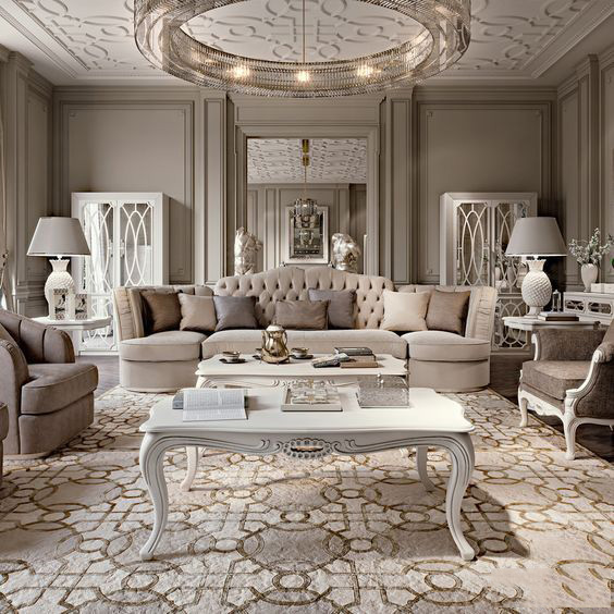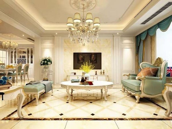 地毯也是欧式风格的代表元素,地毯的大小通常以客厅所有沙发的边缘开始,到另一边沙发中间的所有面积铺满为宜。